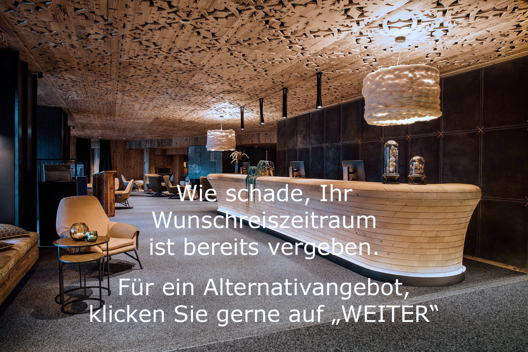 Unsere Mitarbeiter der Reservierung senden Ihnen gerne für einen anderen, noch verfügbaren, Zeitraum ein Angebot zu.